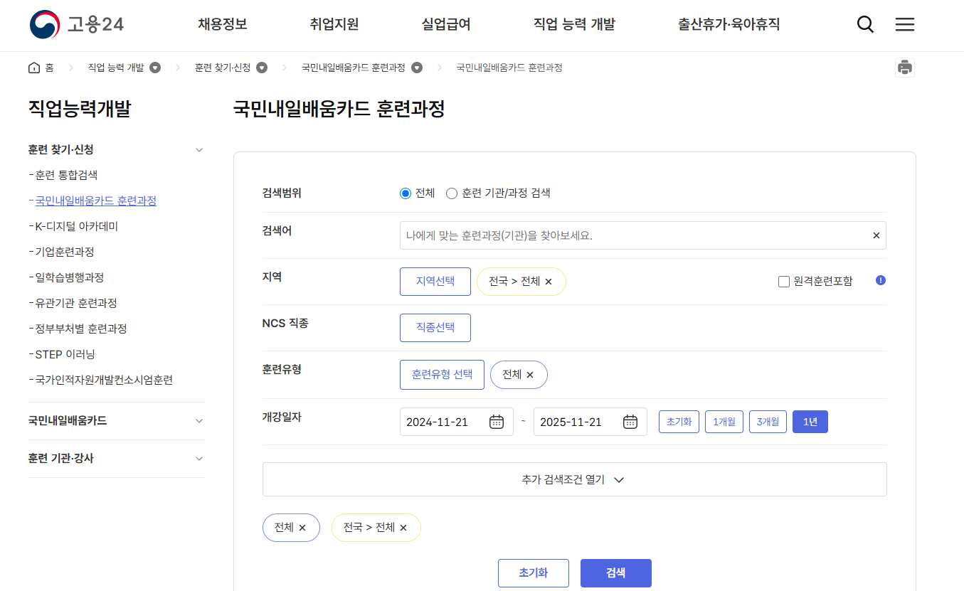 고용24 홈페이지 > 직업 능력 개발 > 훈련 찾기신청 > 국민내일배움카드 훈련과정에서