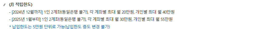 2025년 1월부터 월 적립한도가 각 계좌별 최대 월 30만 원, 개인별 최대 월 55만 원으로 증가했습니다.