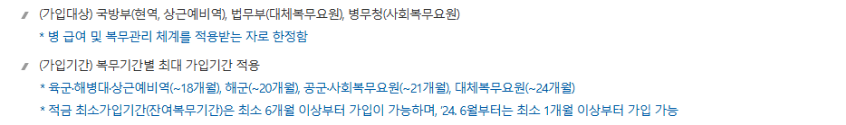 A: 24.6월부터는 잔여복무기간이 최소 1개월 이상부터 가입할 수 있습니다. 다만, 복무 기간이 끝난 후에는 가입이 불가능합니다.