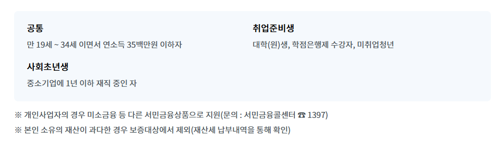 사회 초년생으로서 중소기업에 1년 이해 재직 중인 경우에도 신청이 가능합니다. 개인사업자의 경우 해당되지 않으며 미소금융 등 다른 서민금융상품으로 지원해야 합니다.